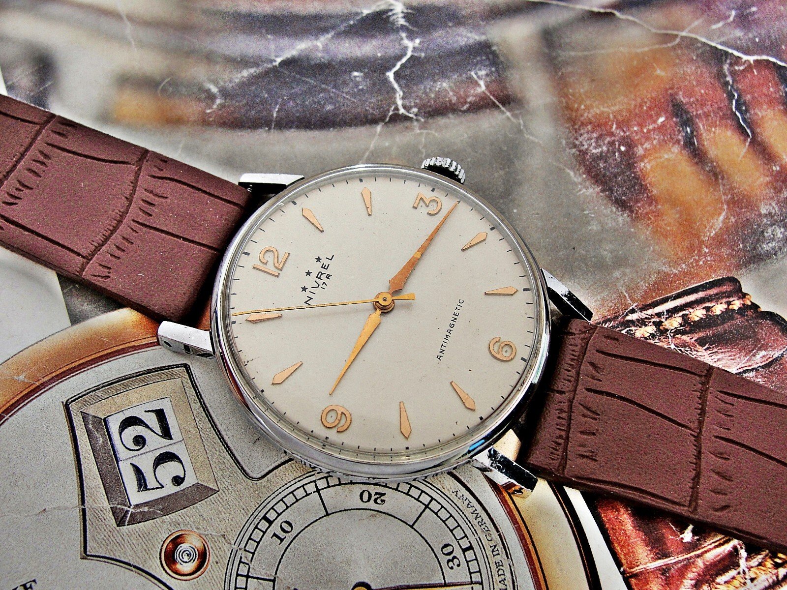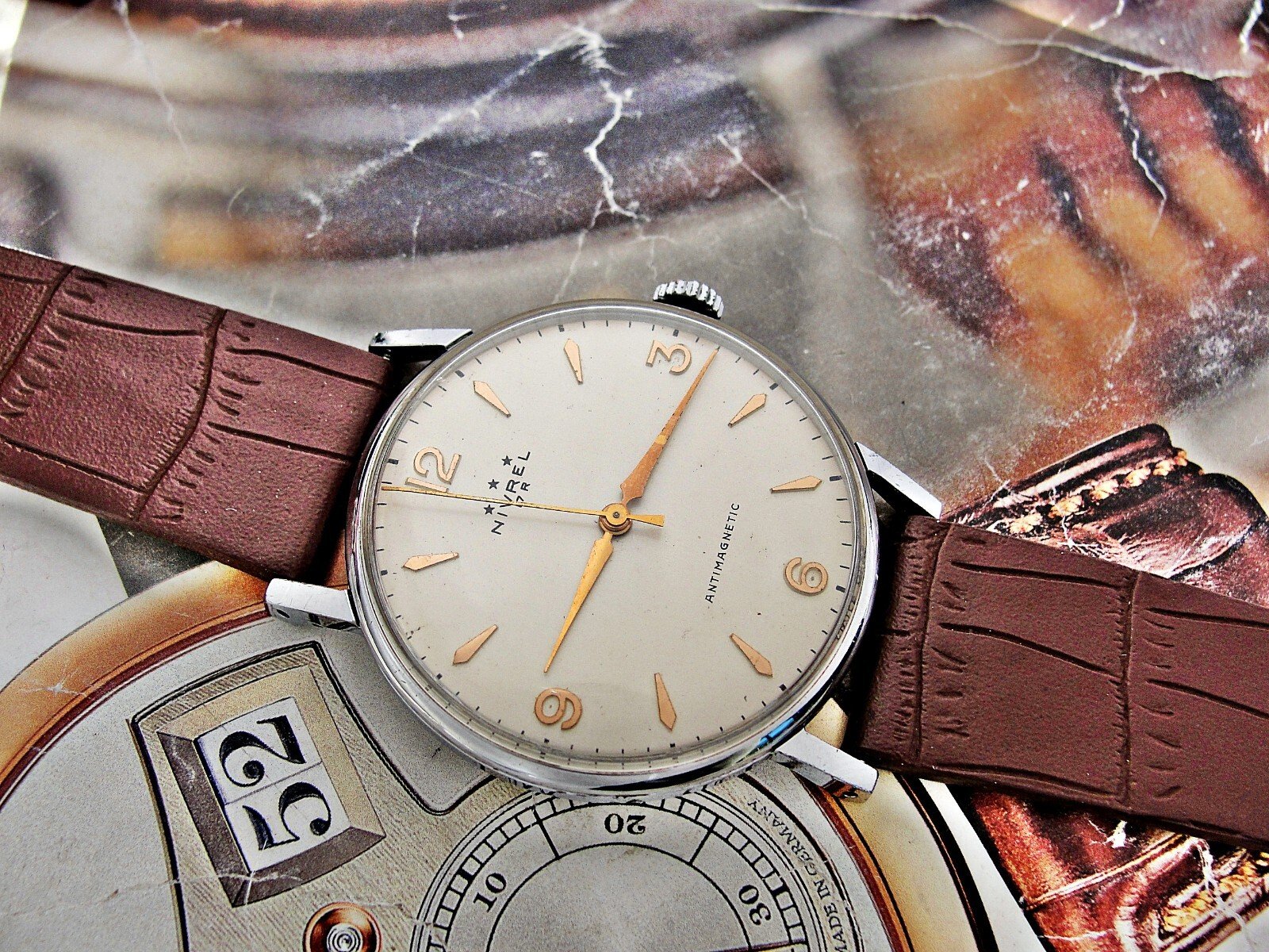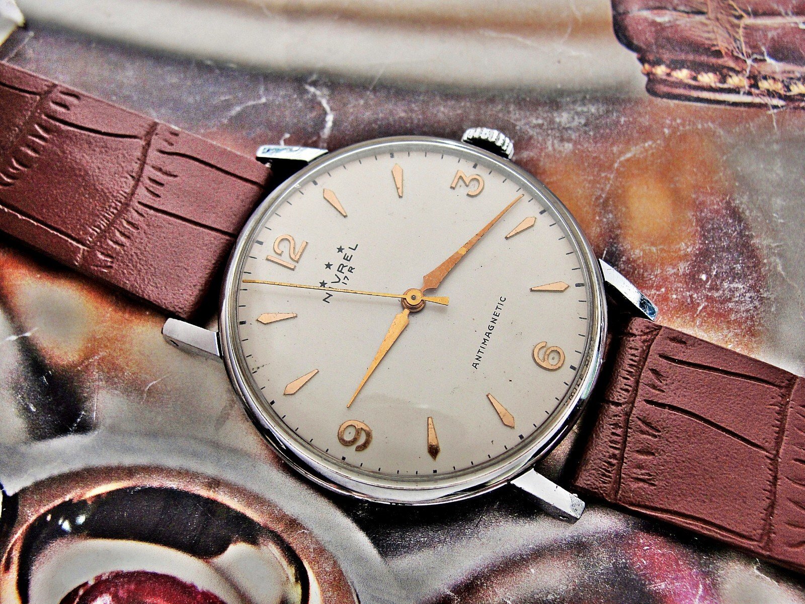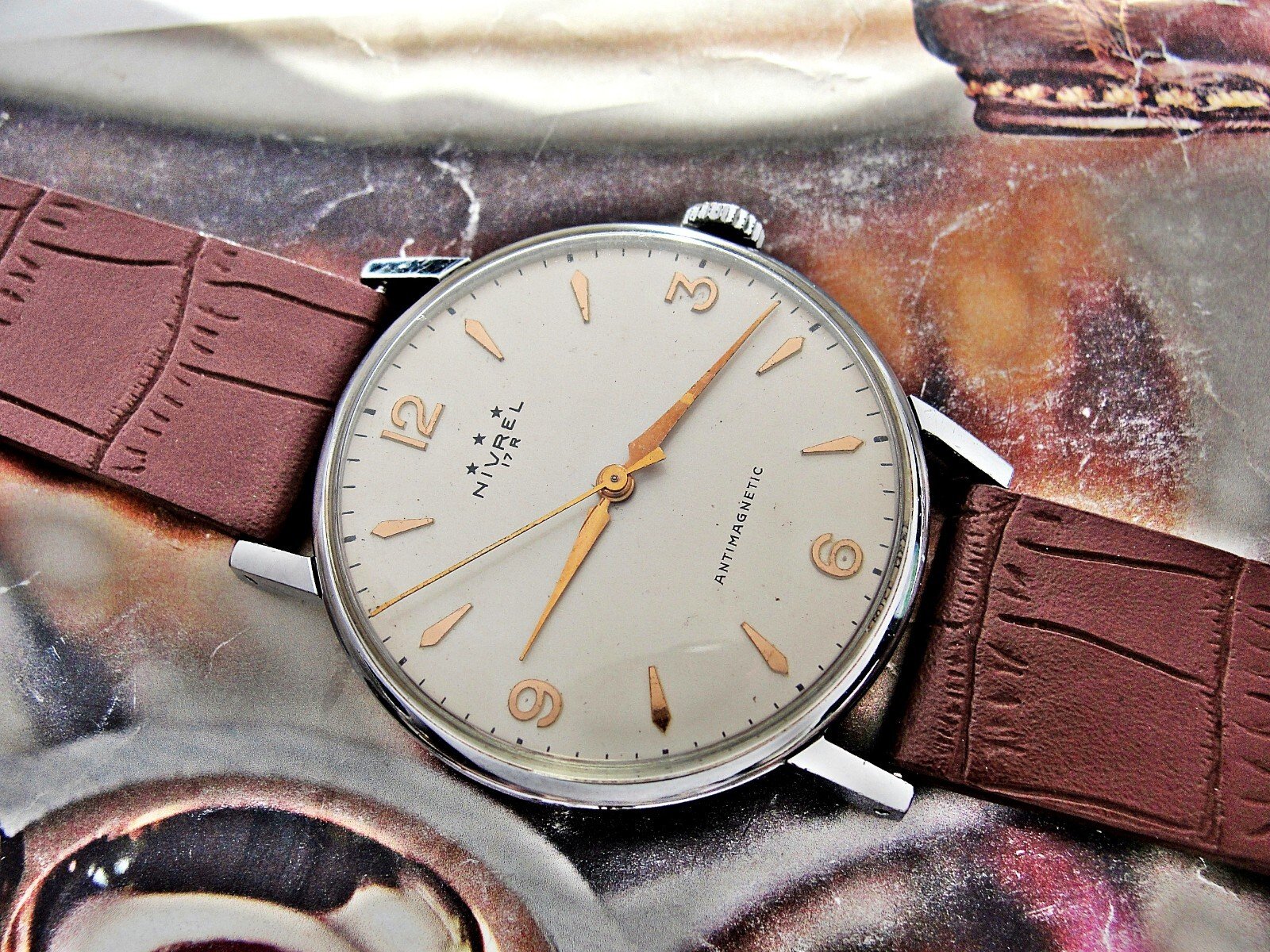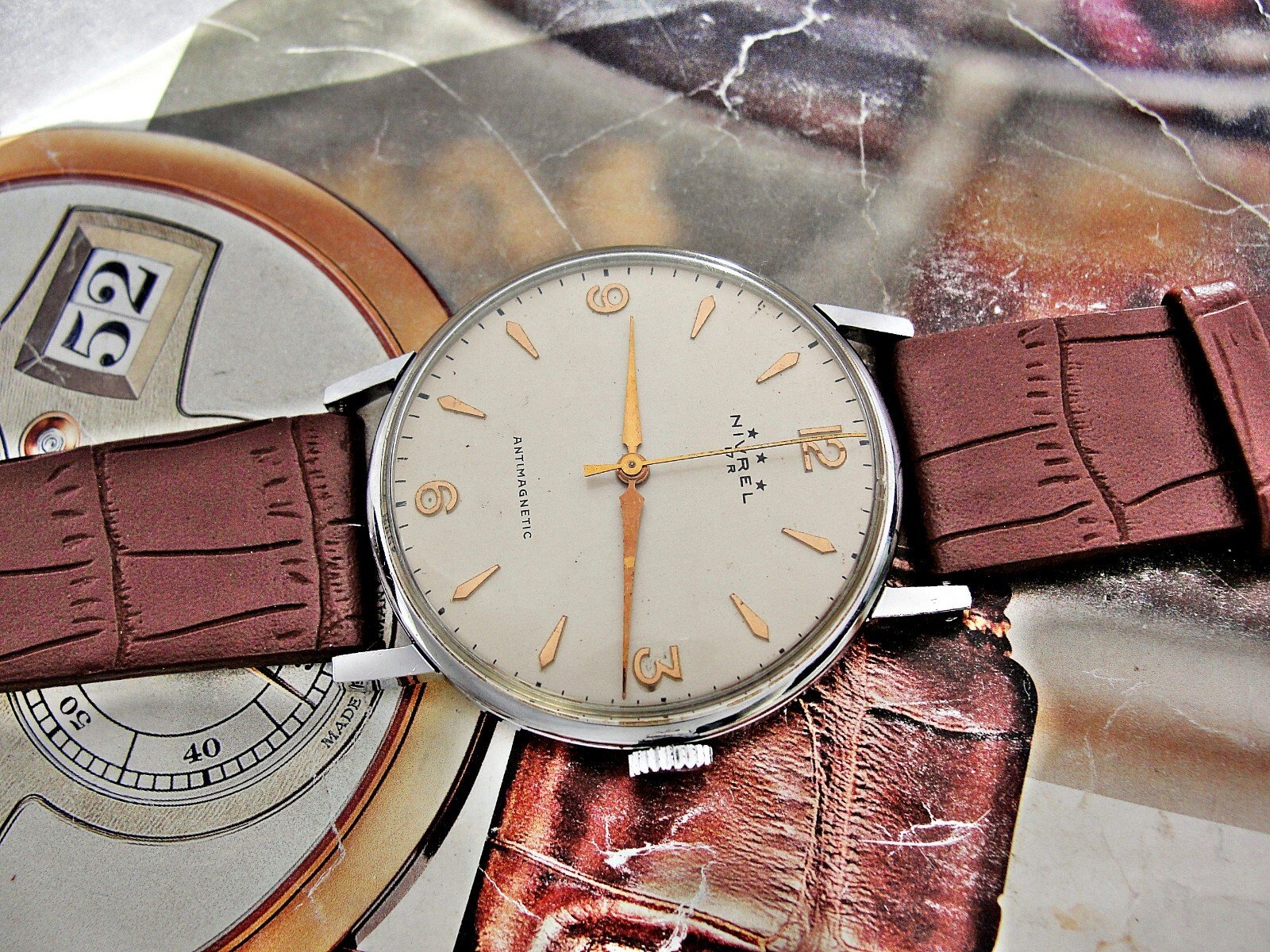 Nice Swiss Nivrel watch from the 1950s. Very nice case, nice dial, mechanical movement, nice leather strap.