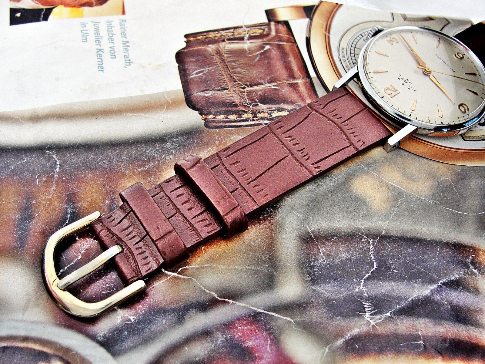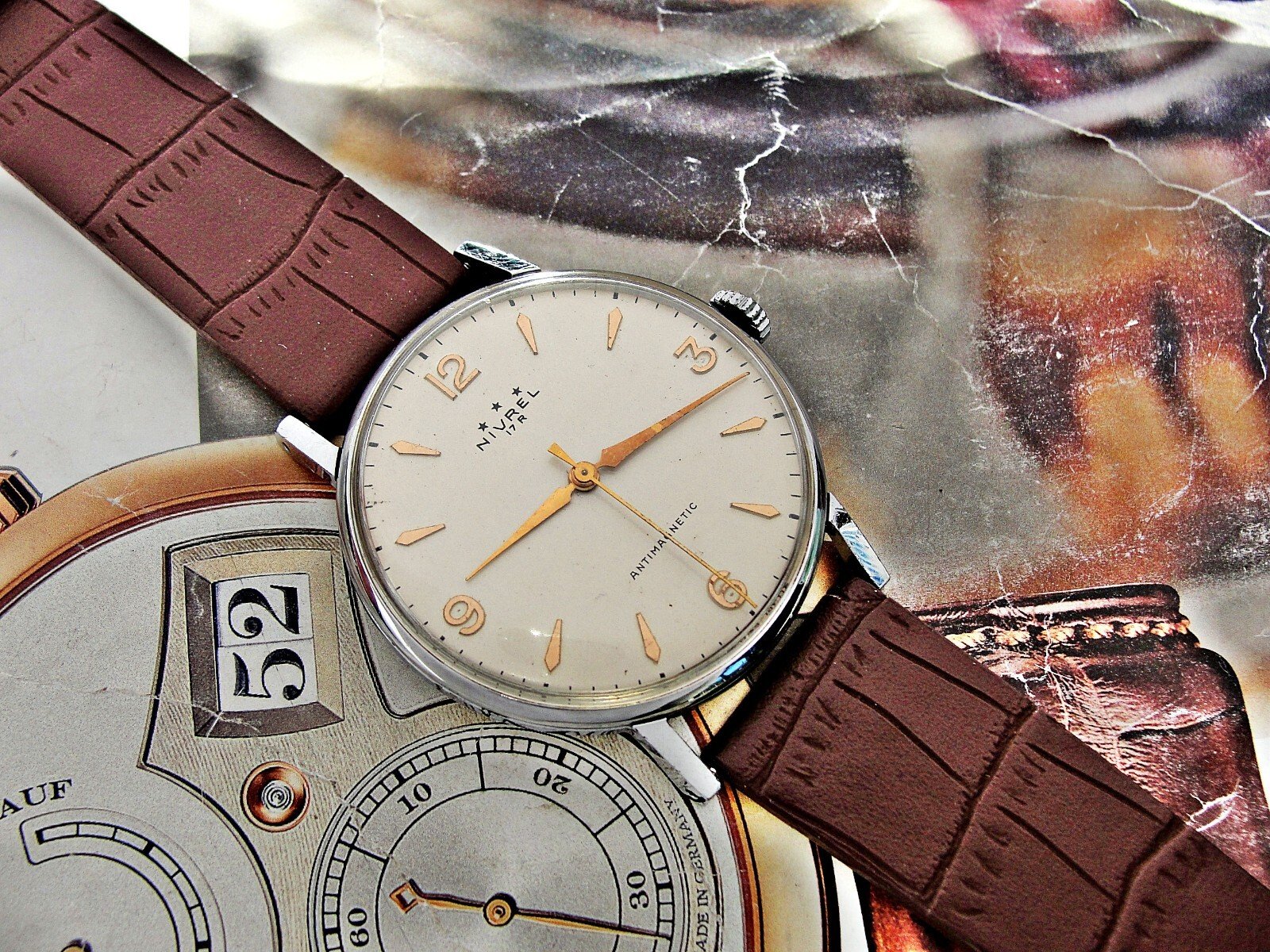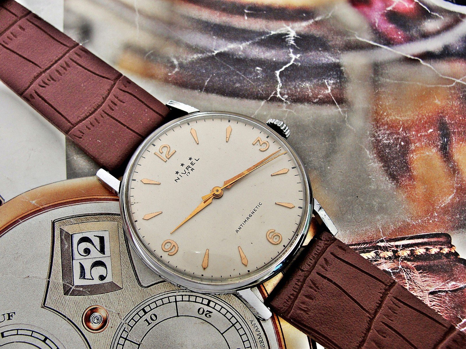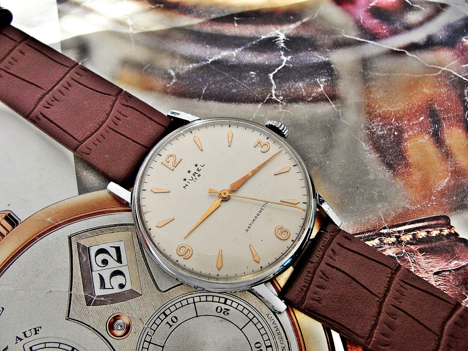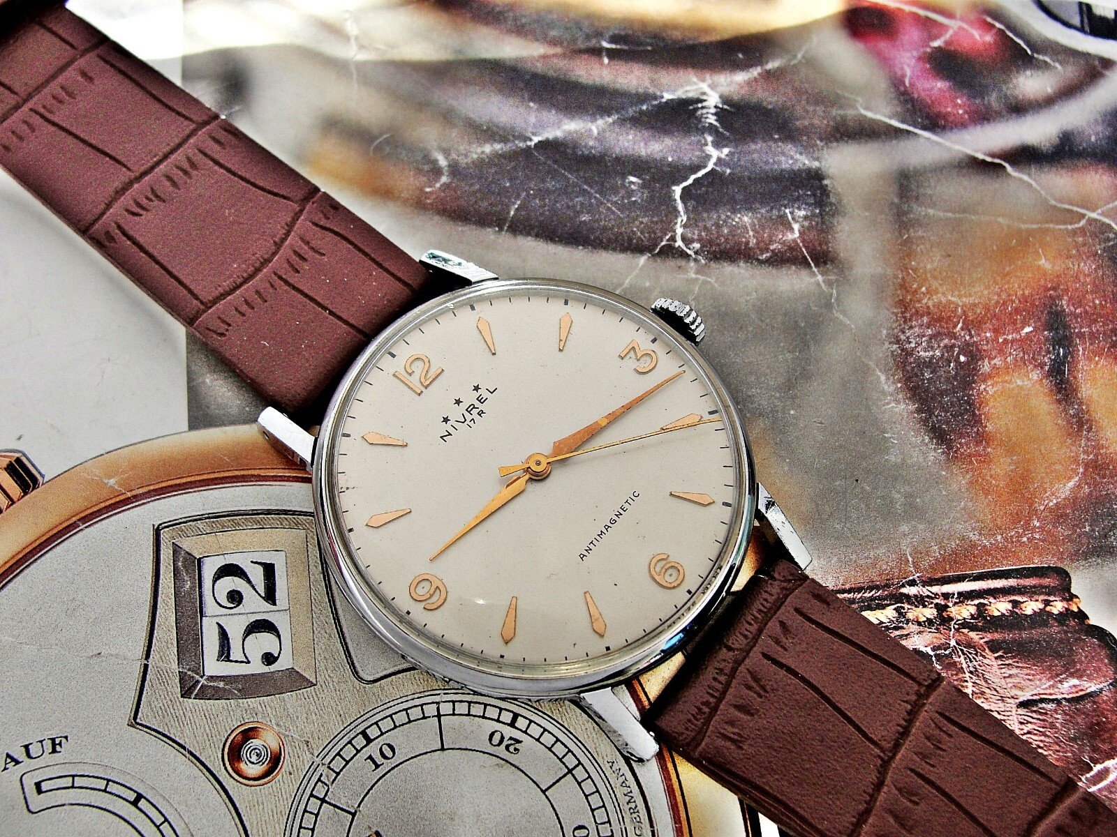 Nice Swiss Nivrel watch from the 1950s. Very nice case, nice dial, mechanical movement, nice leather strap.