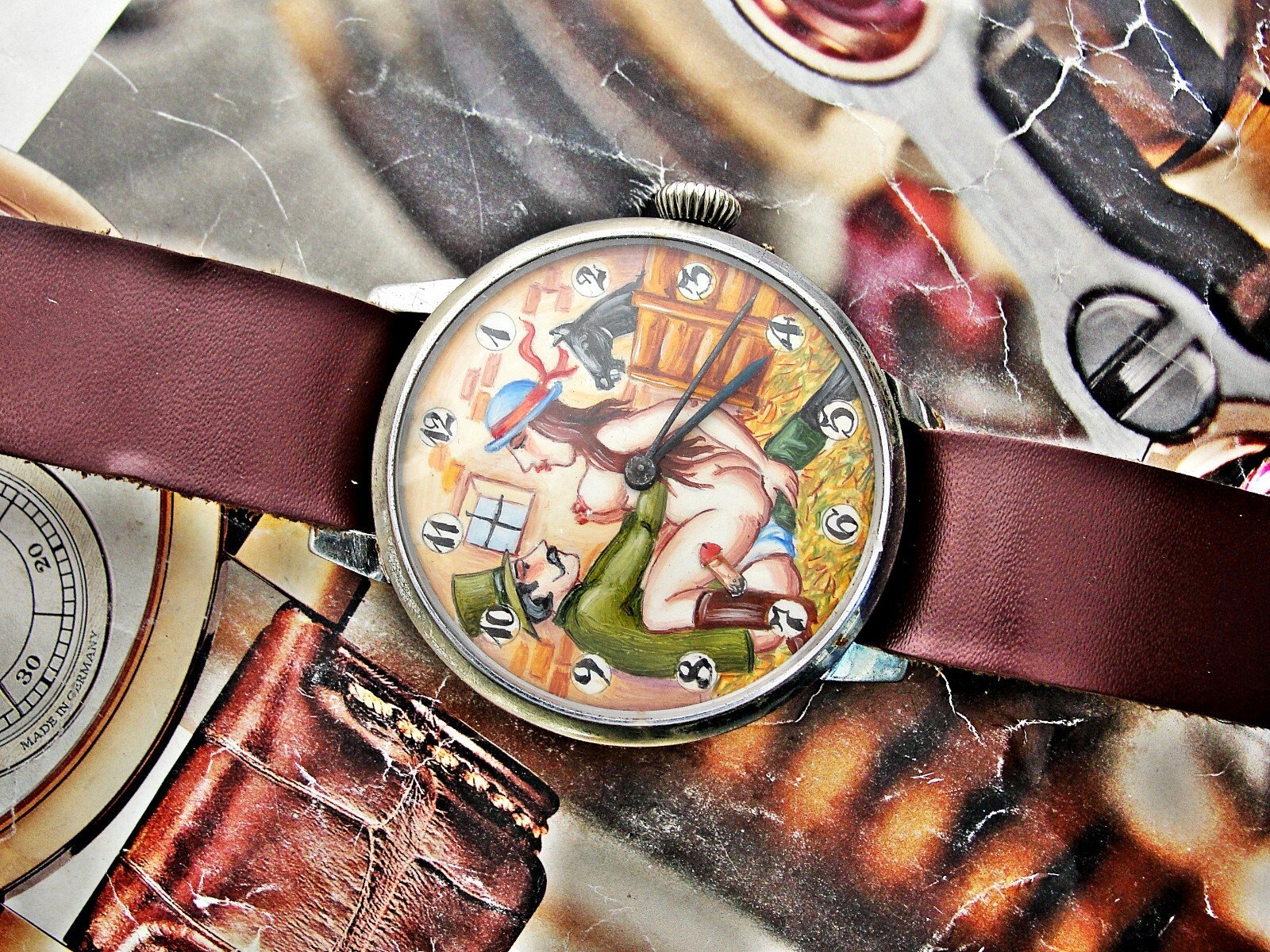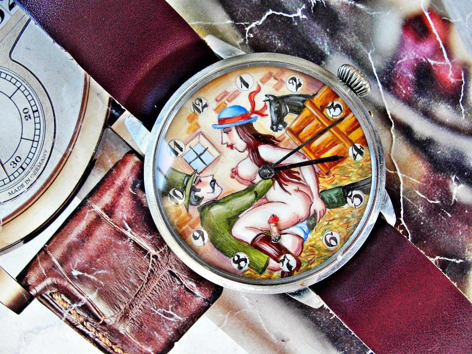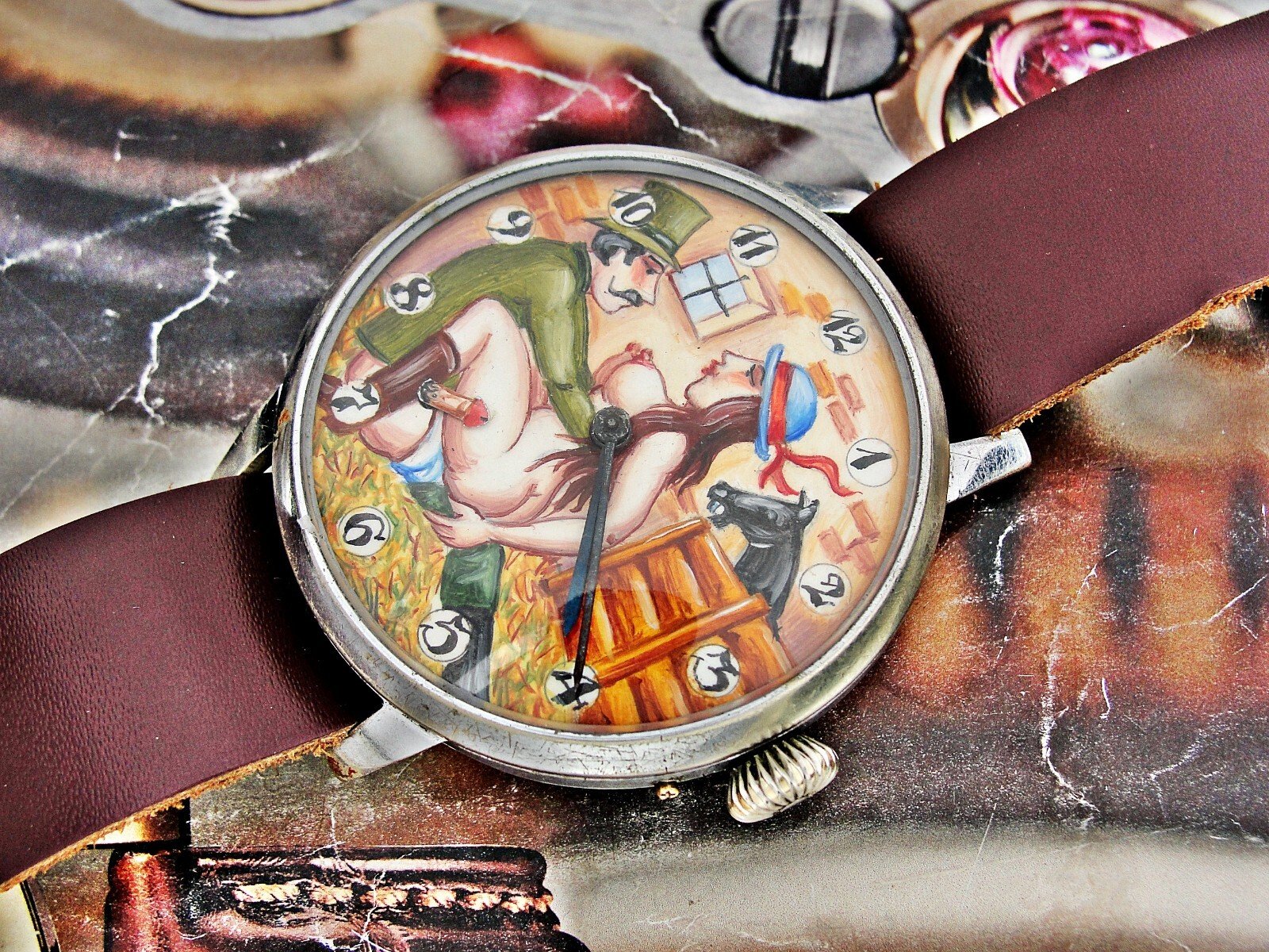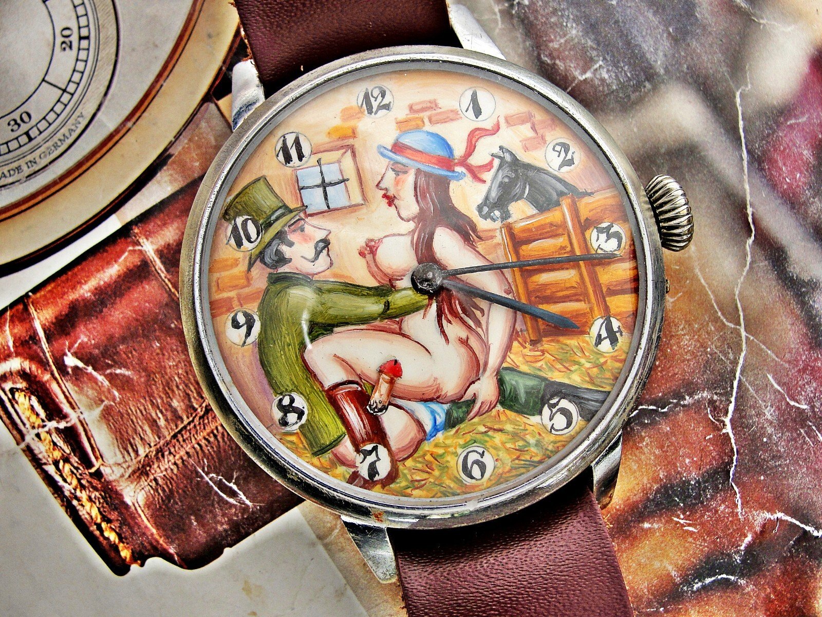 Rare erotic hand-painted wristwatch from the 1920s. Very nice hand-painted dial, the penis moves up and down, the watch mechanism moves it. Leather strap. Push-button hand adjustment. Between 3-4 o'clock, the small button can be pressed and held to adjust the hand by turning the crown. If the small button is not pressed, the watch can be wound with the crown. Works.. Size 45mm measured without crown.