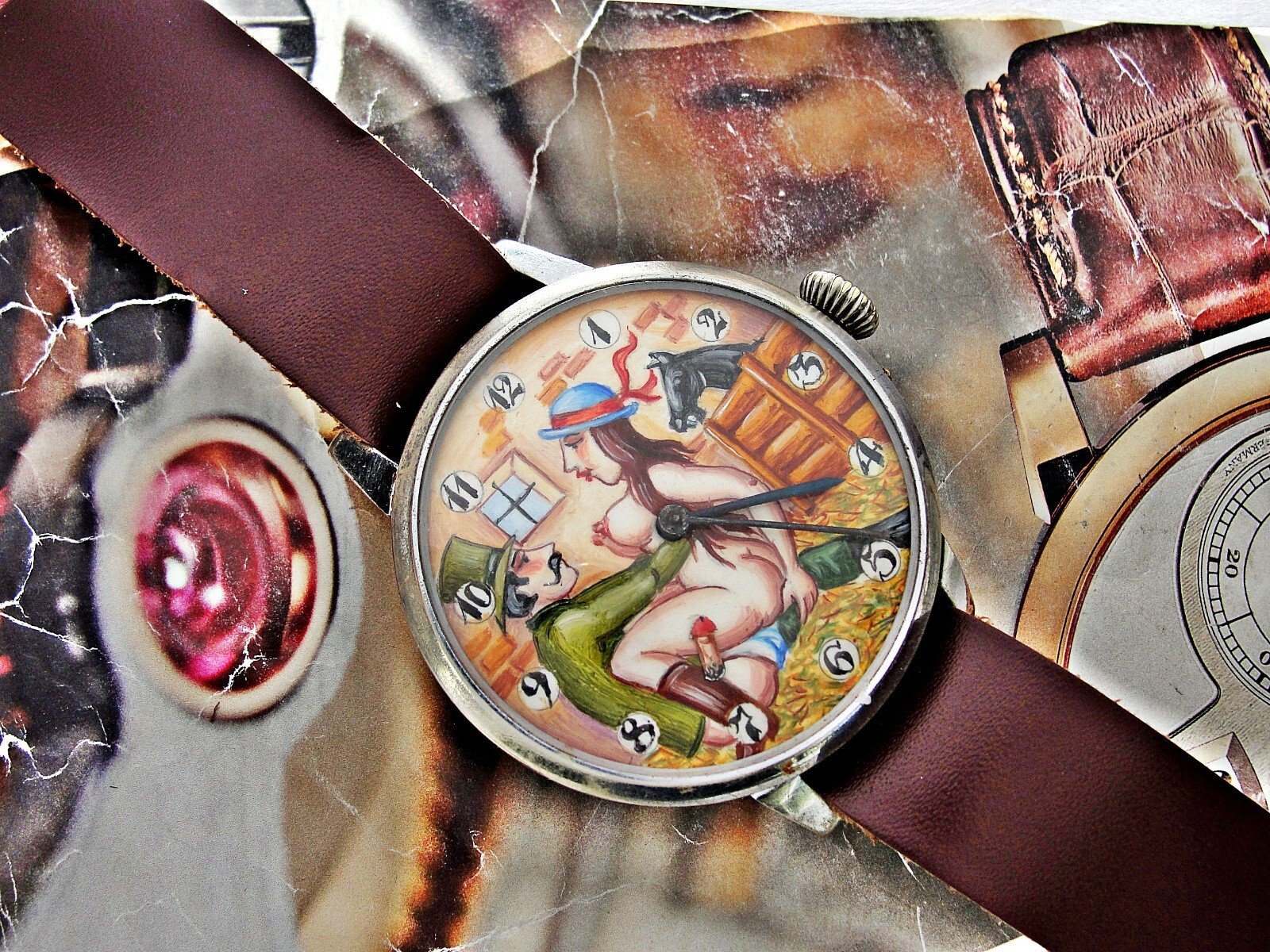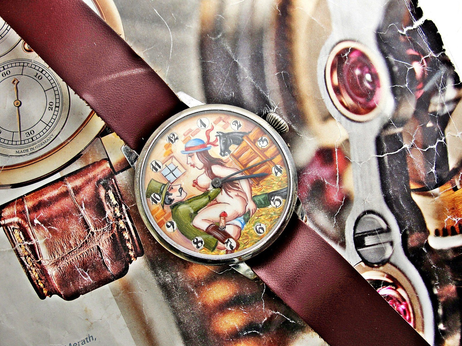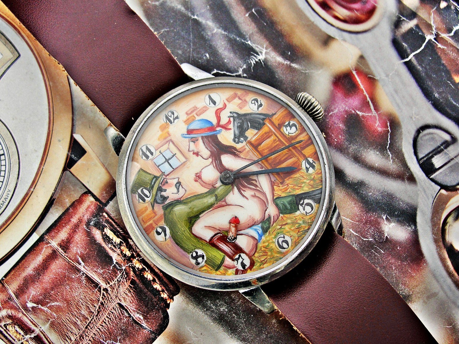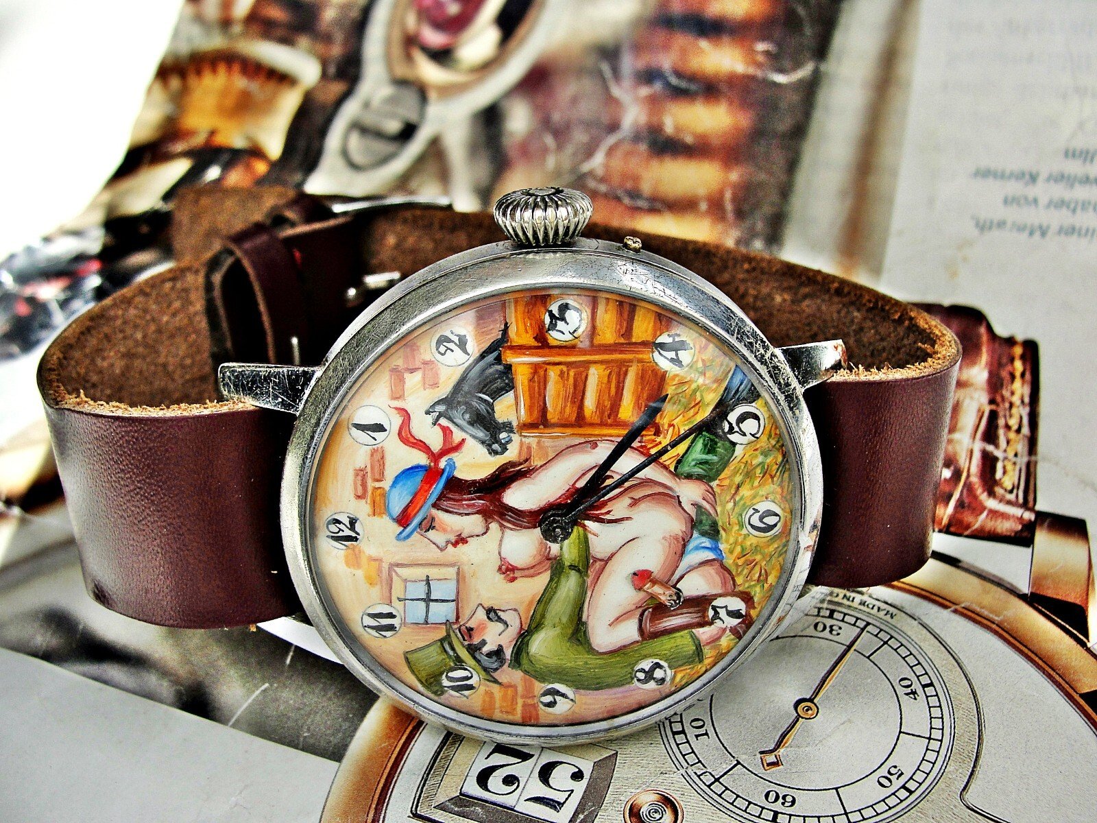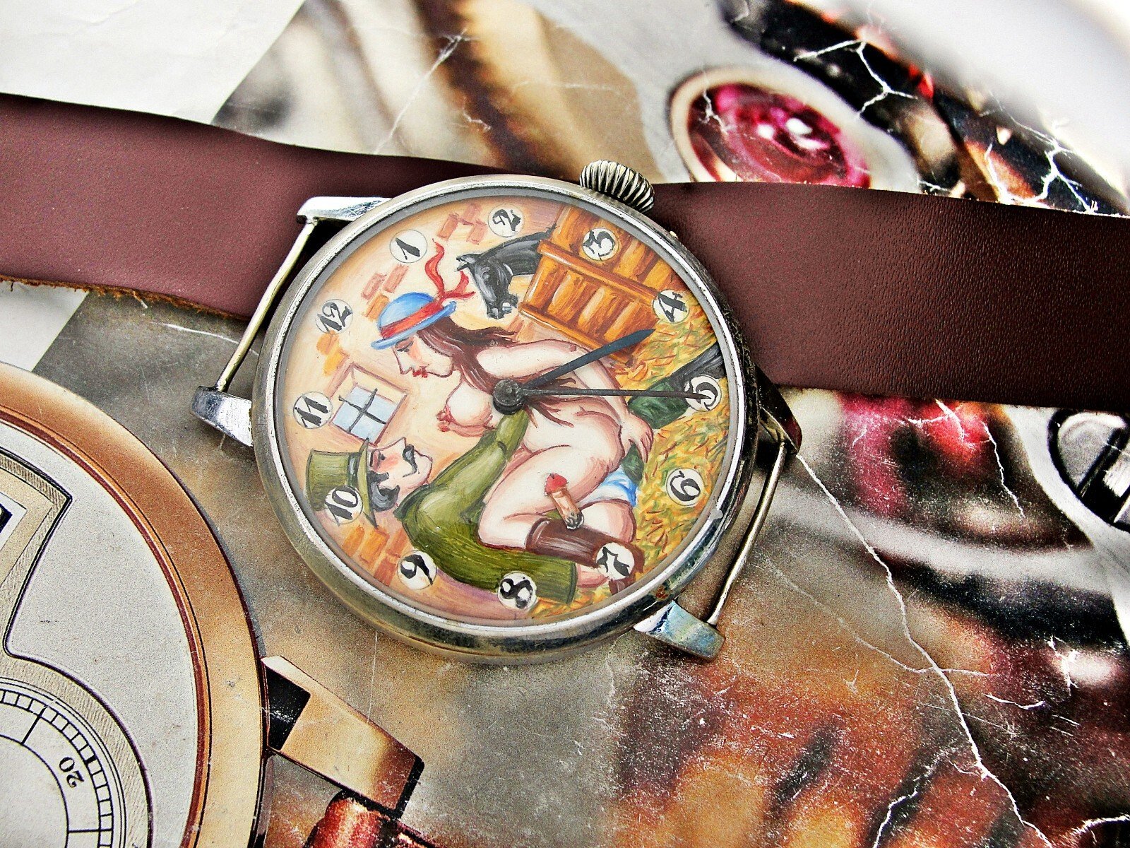 Rare erotic hand-painted wristwatch from the 1920s. Very nice hand-painted dial, the penis moves up and down, the watch mechanism moves it. Leather strap. Push-button hand adjustment. Between 3-4 o'clock, the small button can be pressed and held to adjust the hand by turning the crown. If the small button is not pressed, the watch can be wound with the crown. Works.. Size 45mm measured without crown.
