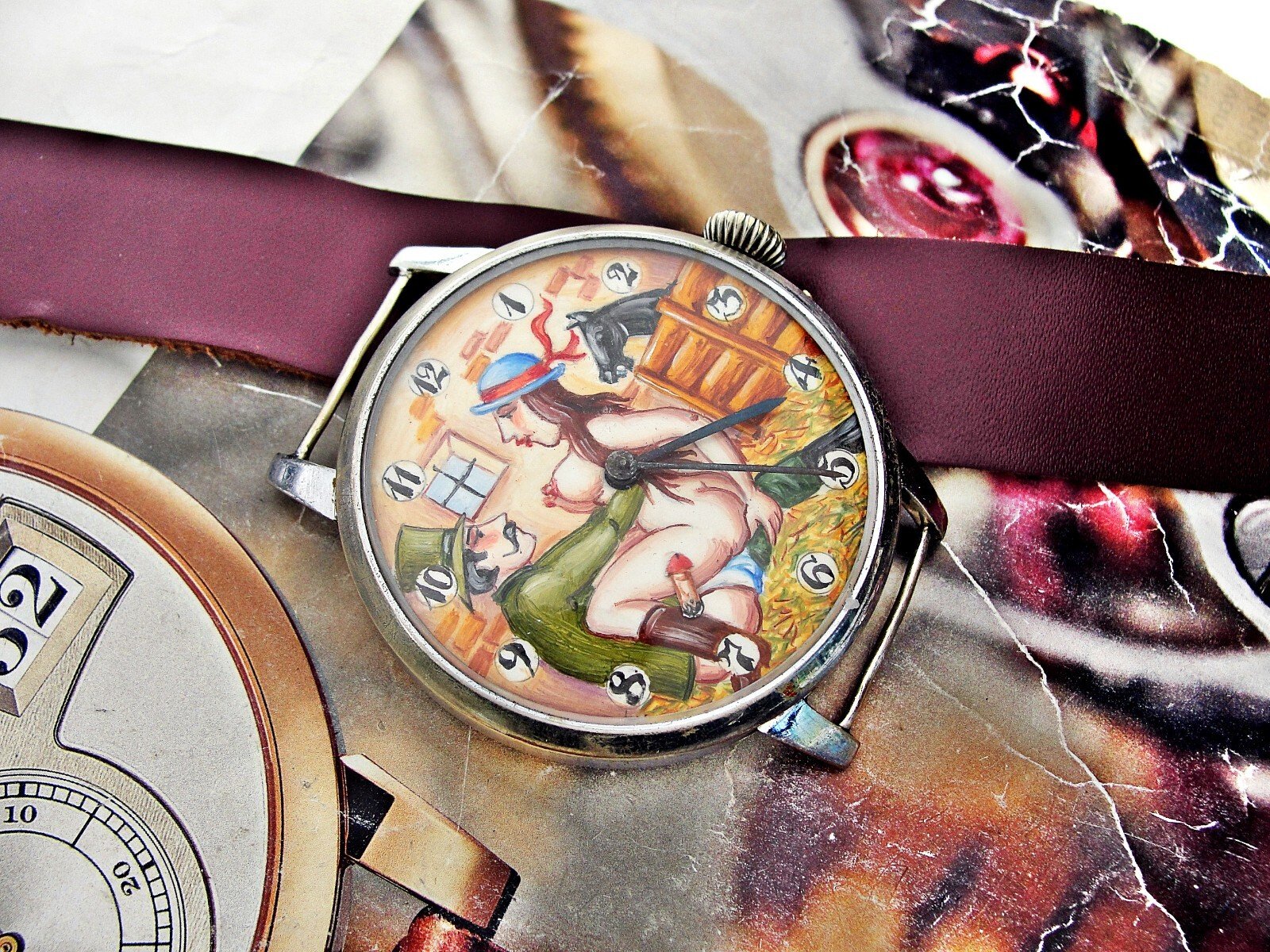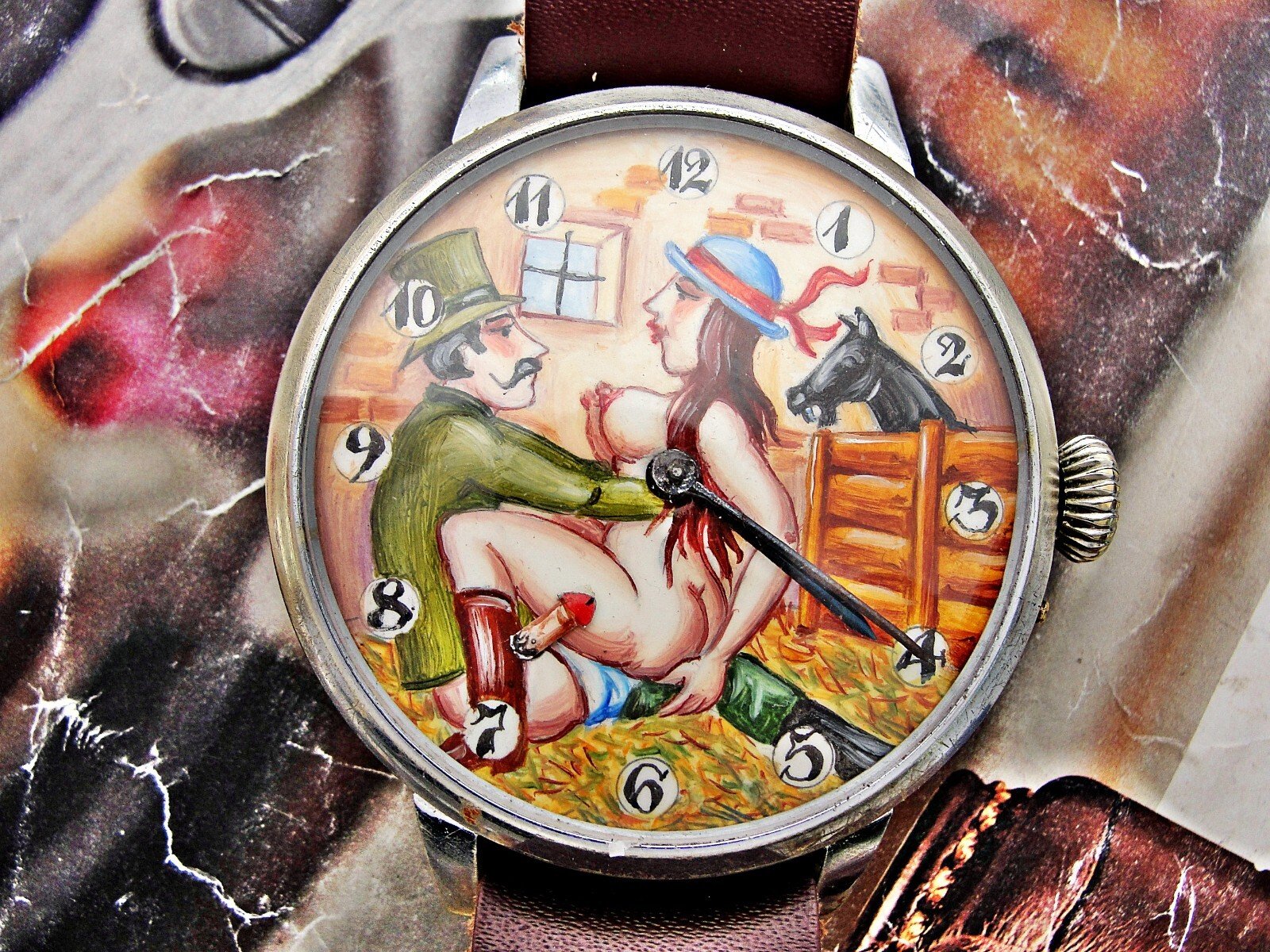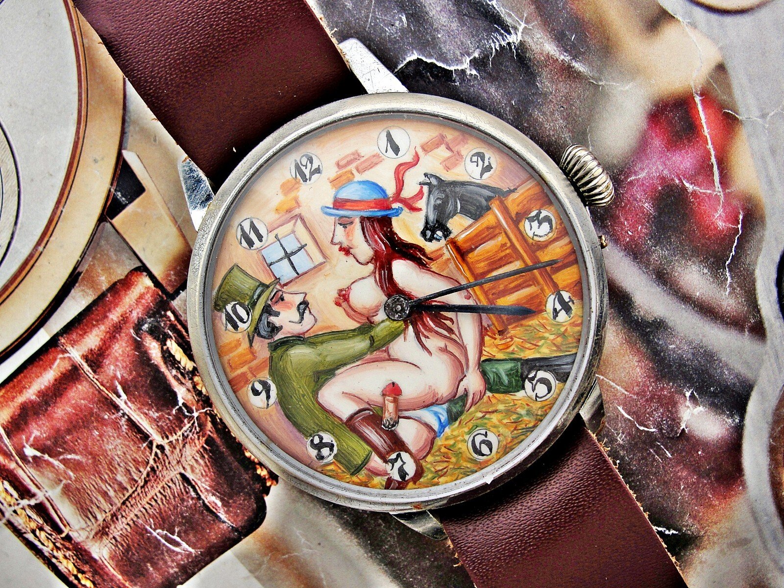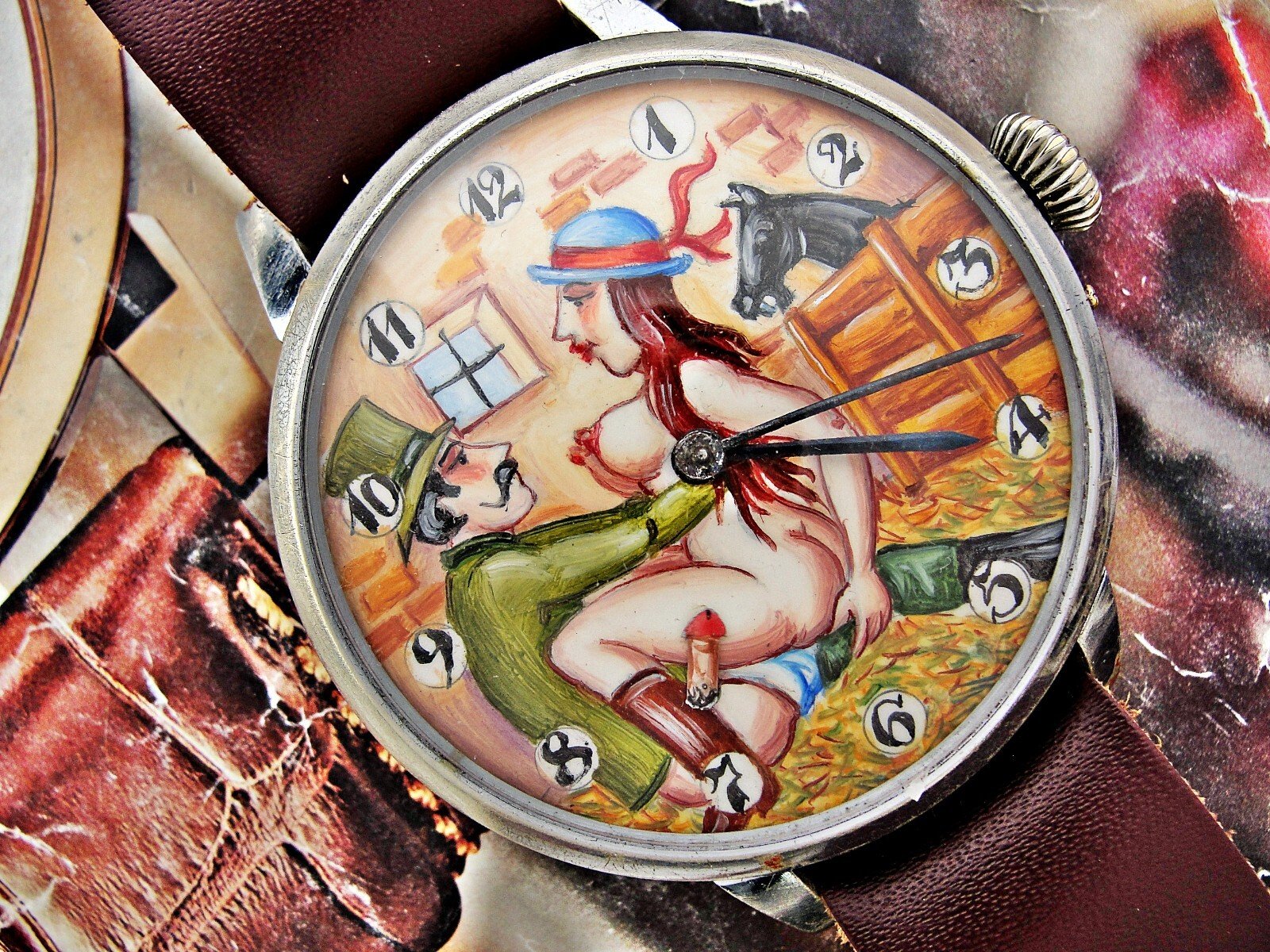 Rare erotic hand-painted wristwatch from the 1920s. Very nice hand-painted dial, the penis moves up and down, the watch mechanism moves it. Leather strap. Push-button hand adjustment. Between 3-4 o'clock, the small button can be pressed and held to adjust the hand by turning the crown. If the small button is not pressed, the watch can be wound with the crown. Works.. Size 45mm measured without crown.