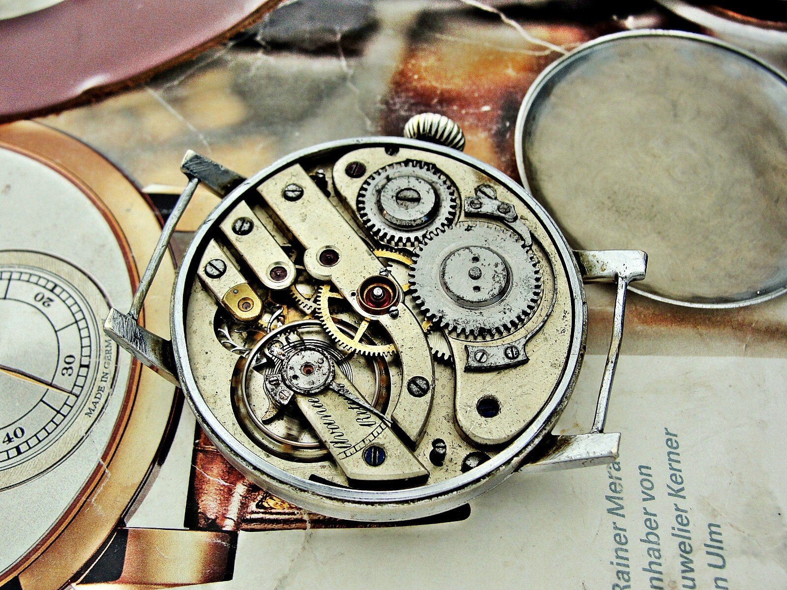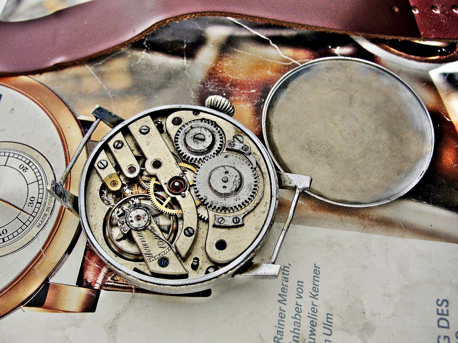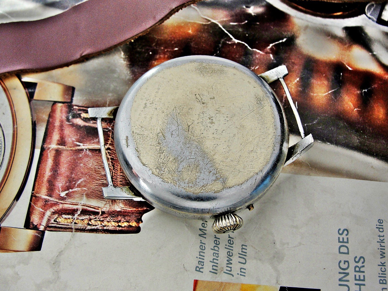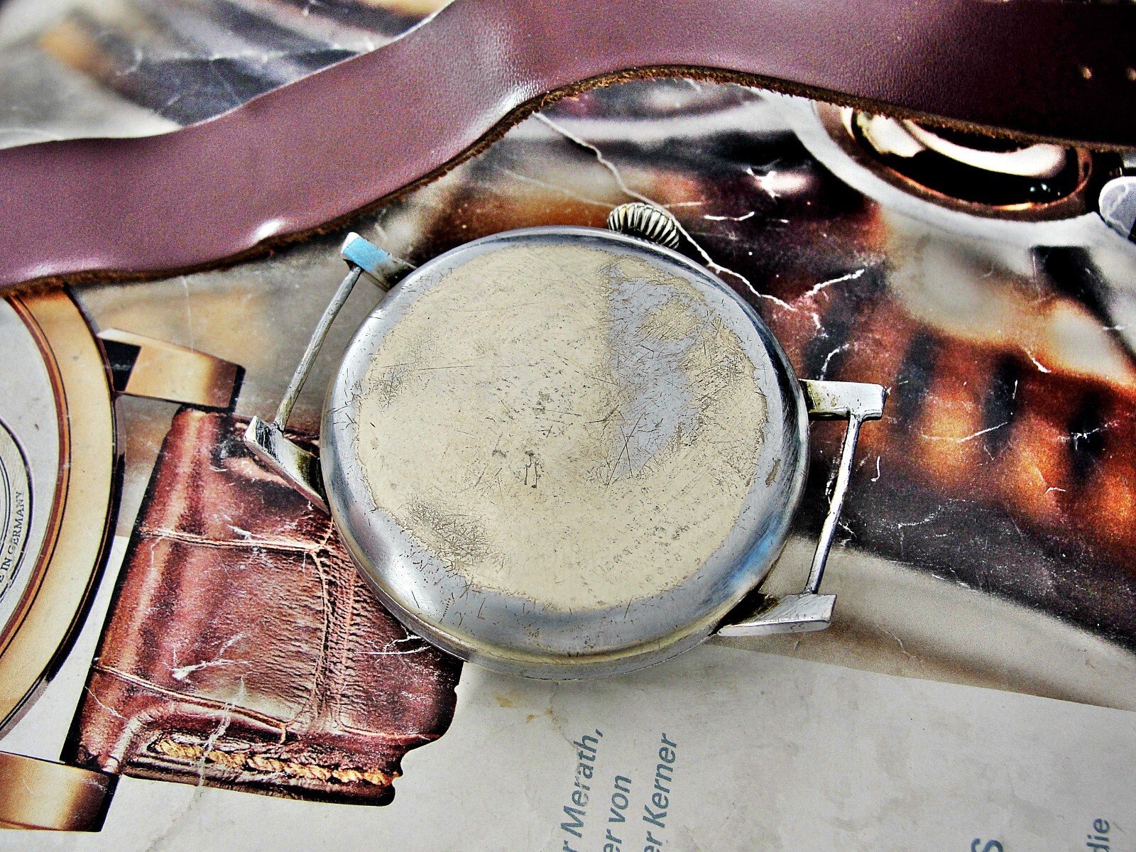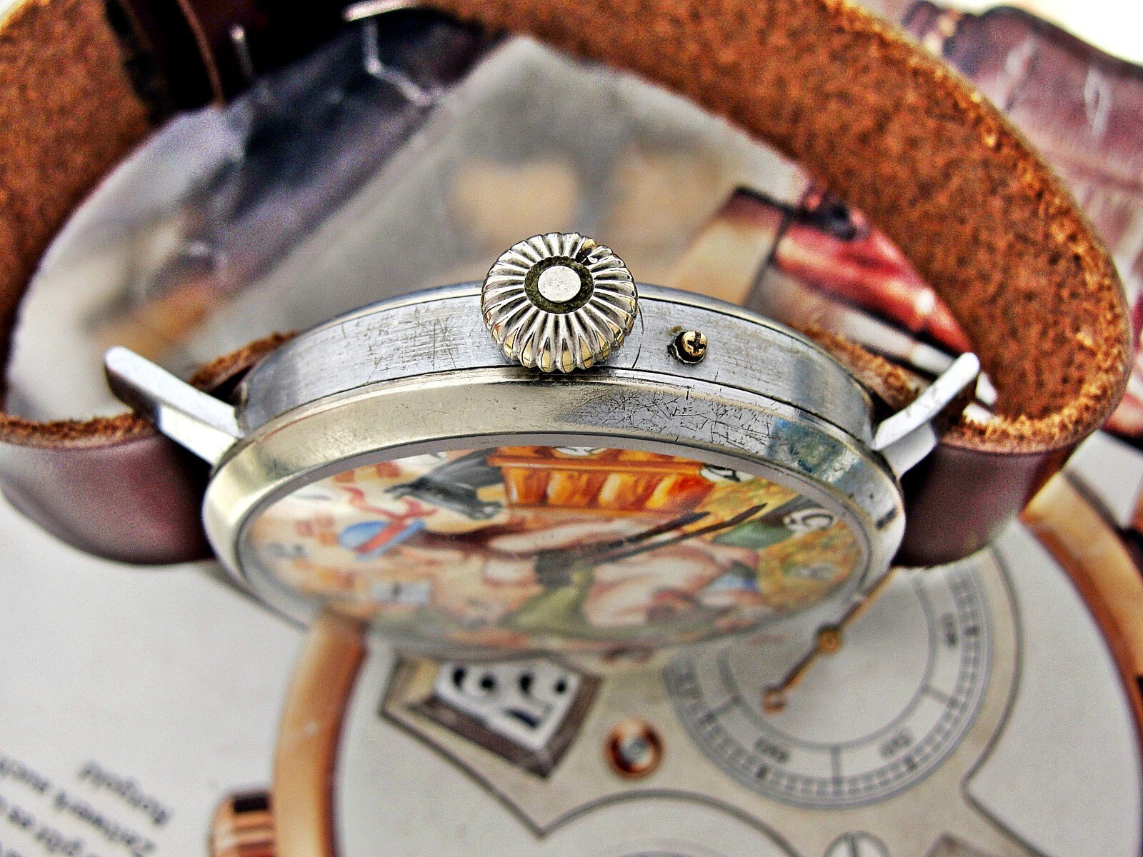Rare erotic hand-painted wristwatch from the 1920s. Very nice hand-painted dial, the penis moves up and down, the watch mechanism moves it. Leather strap. Push-button hand adjustment. Between 3-4 o'clock, the small button can be pressed and held to adjust the hand by turning the crown. If the small button is not pressed, the watch can be wound with the crown. Works.. Size 45mm measured without crown.