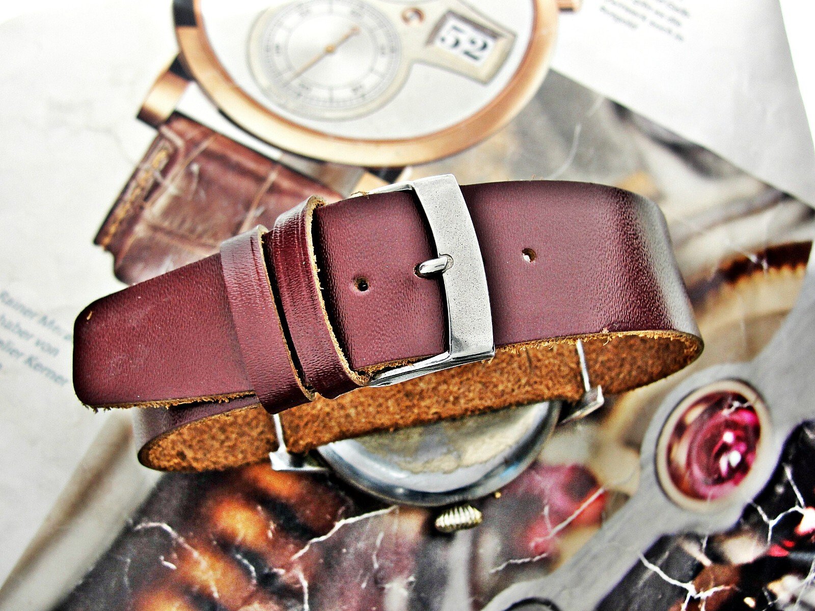 Leather strap. Push-button hand adjustment.